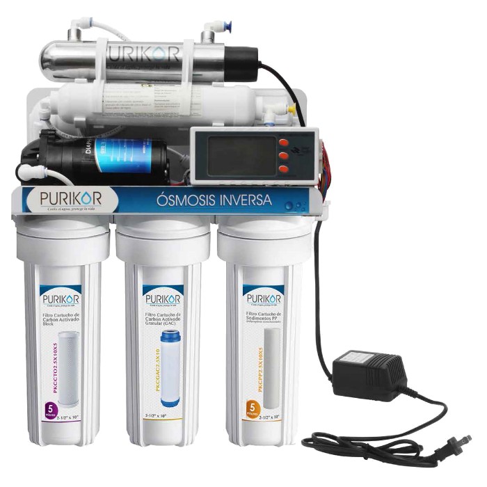 El sistema PURIKOR de ósmosis inversa, utiliza técnicas avanzadas para entregar agua saludable y obtener un buen sabor. La parte central de la unidad es la membrana de ósmosis inversa con una precisión de 0.001 micrones que remueven bacterias, metales pesados, sales minerales, sustancias dañinas y otras sustancias químicas disueltas en el agua. Se comprende de filtros cartucho y membrana ósmosis inversa. Todos los modelos incluyen conexión de agua desecho, conexión alimentación de agua, llaves para portafiltros y portamembrana, mangueras tubing, llave de ganso de lujo y tanque de almacenamiento. Este tipo de sistema cuenta con certificación CE.