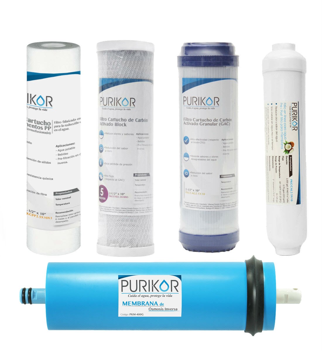 Los kits PURIKOR completos para sistemas de ósmosis inversa punto de uso (POU), compuestos por filtros de polipropileno, ofrecen la reducción de sedimentos en el agua, por su material de construcción proporciona una alta retención de sólidos y buena resistencia química, altos rangos de remoción y mejor retención de partículas contaminantes. Los Filtros de carbón activado block CTO, granular GAC y granular en línea gracias a su diseño permiten extraer partículas diminutas del agua, lo cual produce una reducción de cloro, sabores, olores y sedimentos presentes en el agua. La membrana para ultrafiltración ayuda a remover los sólidos suspendidos, algunos virus y bacterias en el agua. Las lámparas de luz ultra violeta le ofrecen una solución altamente eficiente y económica para desinfectar el agua de bacterias, virus y hasta microorganismos resistentes al cloro (excepto modelo PKRO100-5P).